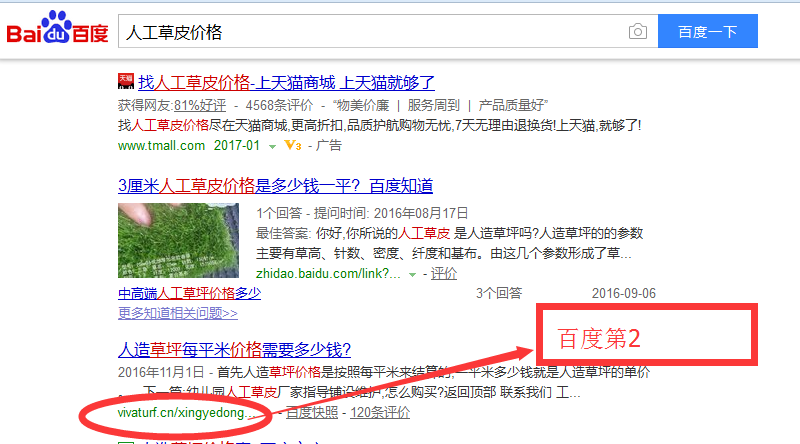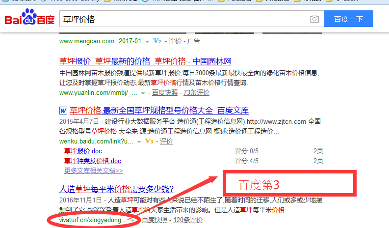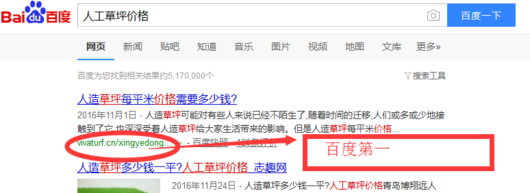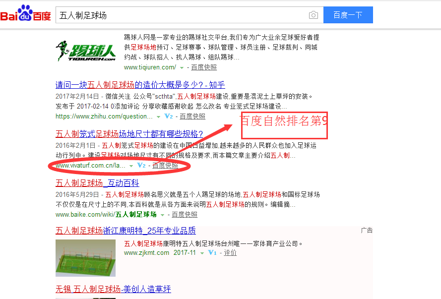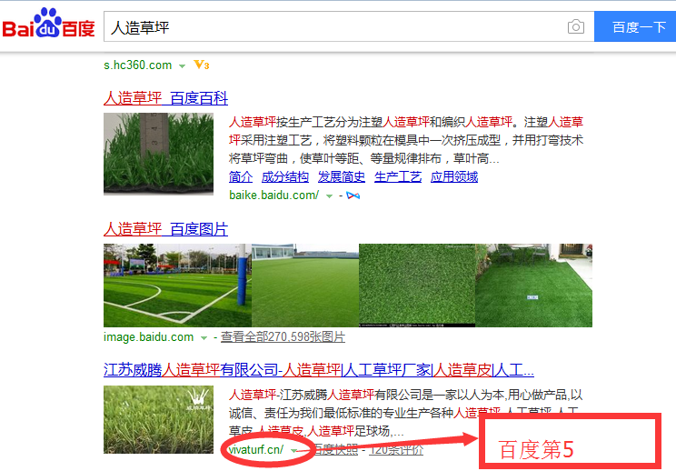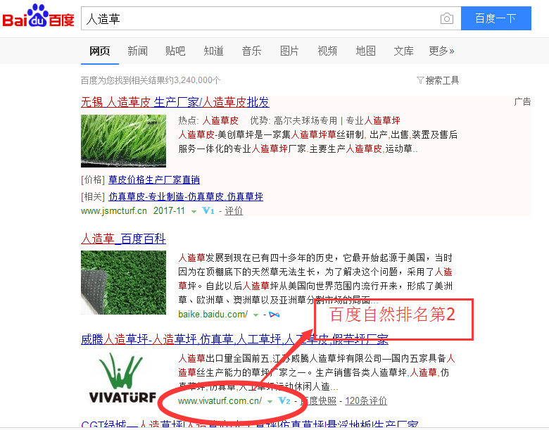 威腾两个网站百度seo自然排名,多个词排在百度首页。其中转化率高的人造草坪价格、人工草坪价格以及行业竞争程度非常高的足球场人造草坪、笼式足球场等都排在百度前三位。